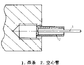 如圖所示,取一外徑比欲取螺釘?shù)讖铰孕〉目招墓芄茏觾?nèi)徑應(yīng)比焊條略大。將管子內(nèi)孔倒45°角。然后,將管子倒角端緊貼欲取桿端面。電焊條從管內(nèi)孔伸進從里面焊牢。冷卻后用管鉗旋出。內(nèi)孔仍保證完好如初,不影響使用。用此法取出螺釘,都不會壞孔、爛扣。用此法也可取斷銷子。